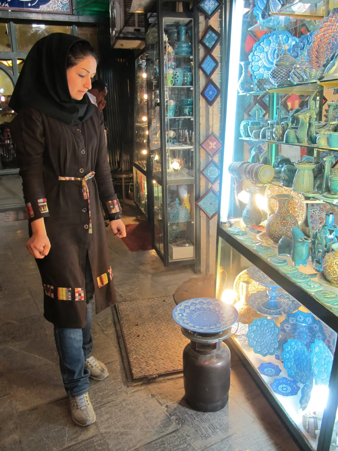 王侯广场的巴扎内,波斯姑娘在自家的工坊兼商铺前加工珐琅盘