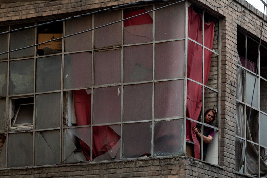 周伍,壹名女子從德黑蘭壹棟受損的建築物裡向外張望。 ARASH KHAMOOSHI FOR THE NEW YORK TIMES