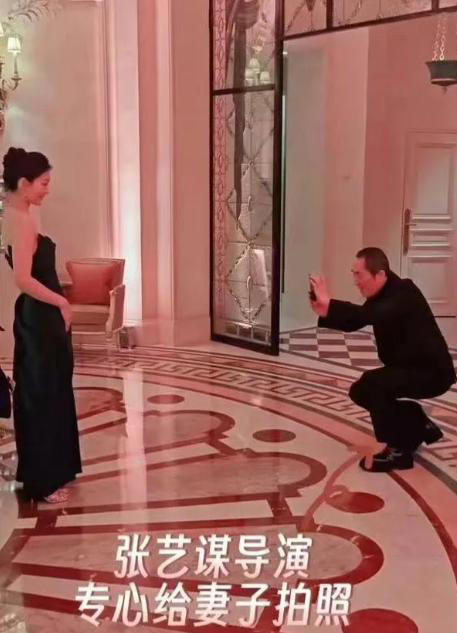 之前還有人拍到,張藝謀不顧 75 歲高齡,蹲下身給陳婷拍照,眼神裡的寵溺藏都藏不住,和他在片場對演員的嚴苛模樣判若兩人。