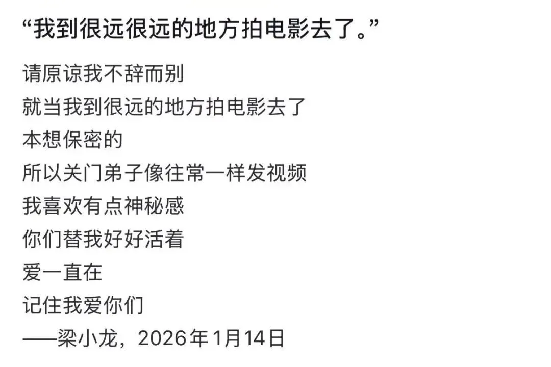 視頻內容為叁張梁小龍的照片,視頻文案寫道:請原諒我不辭而別,就當我到很遠的地方拍電影去了,本想保密的,所以關門弟子像往常壹樣發視頻,我喜歡有點神秘感,你們替我好好活著, 愛壹直在,記住我愛你們。 這段文字最後的署名為梁小龍,時間為2026年1月14日。