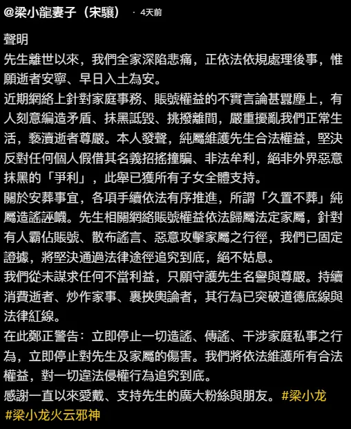 3月20日,梁小龍另壹位徒弟通過賬號“梁小龍妻子(宋驤)” 發布視頻披露,梁小龍去世後其認證社交賬號被自稱 “關門弟子” 的平頭實際控制,該弟子頻繁使用賬號發布內容,甚至以逝者語氣發聲,此舉被指嚴重缺乏對逝者的基本尊重。