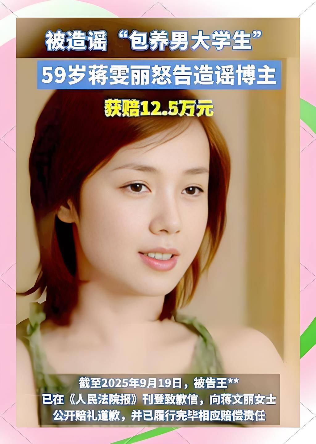 2025年9月,法院作出判决,蒋雯丽胜诉,法院判决王某赔偿蒋雯丽12.5万元,并在《人民法院报》刊登致歉声明。