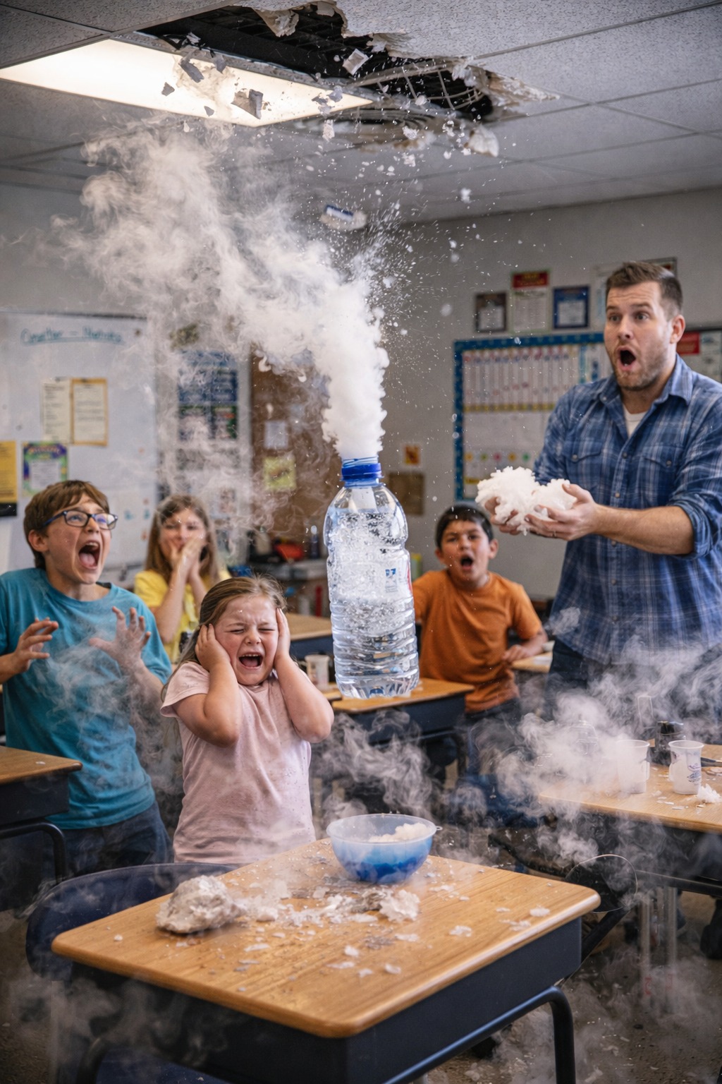 期间,一名学生将干冰放入水瓶并拧紧瓶盖,导致瓶子爆炸并冲击天花板,击穿一块天花板板材,碎片散落教室。事故中有学生和一名教育助理被水溅湿,一名学生需更换衣物,多名学生受到惊吓,至少一人当场哭泣。