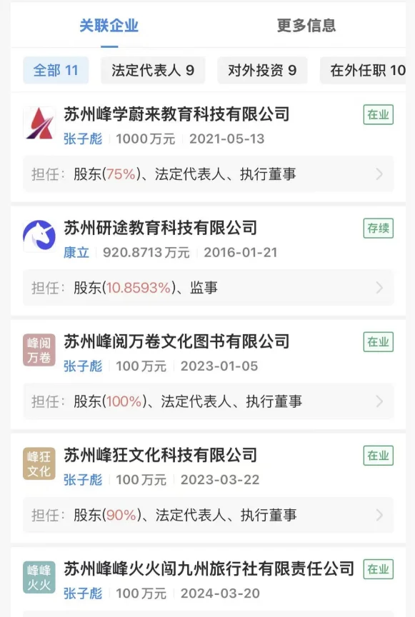 公開信息顯示,他名下關聯公司11家,9家正常存續,業務從教育、旅游,到文化傳播、信息技術服務,覆蓋面極廣。而支撐起他教育IP核心的,是兩家注冊資本千萬級的公司,蘇州峰學蔚來教育科技有限公司(1000萬元)和蘇州研途教育科技有限公司(超920萬元)。