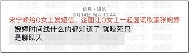 2026年3月14日,宋宁峰私下联系Q女士,授意她 “婉婷已经知道时间线了,你就咬死咱们只是聊聊天”,企图让对方帮自己圆谎掩盖出轨事实。