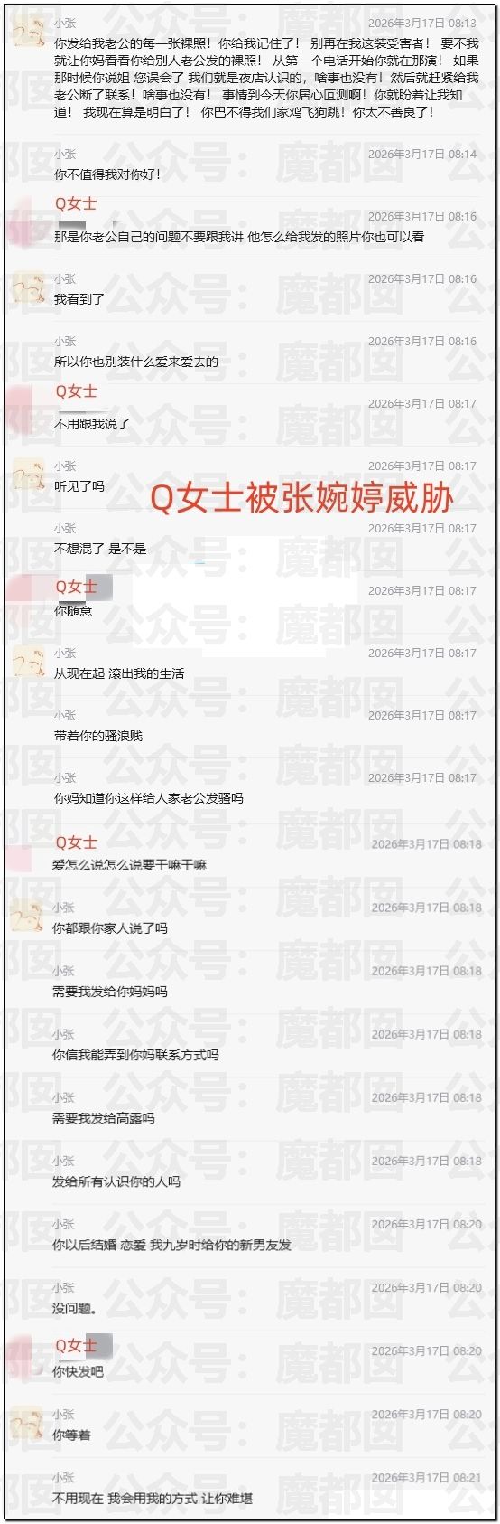 3月17日,宋宁峰妻子张婉婷得知后,直接发信息威胁Q女士,扬言要将其裸照发送给她的家人,还牵扯到了演员高露。