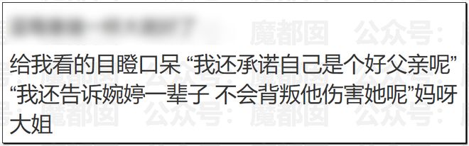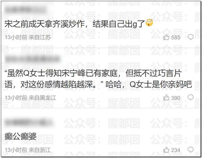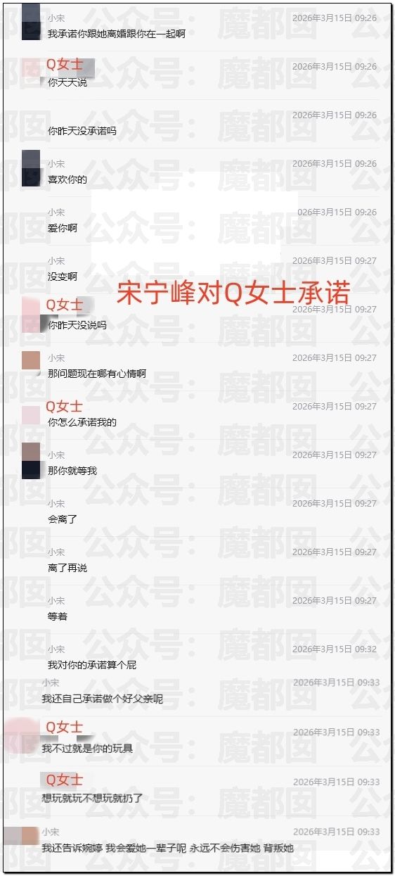 3月15日,两人的聊天记录曝光,宋宁峰先是向Q女士承诺会和张婉婷离婚、与她在一起,转头却翻脸不认人,直言 “承诺算个屁”,毫无担当。