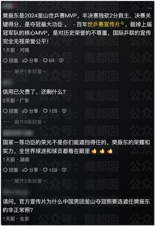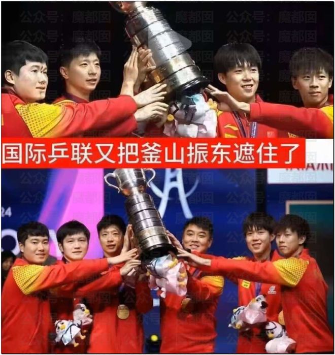 但是!这个全篇回顾乒乓历史的视频里竟然一个樊振东的镜头都没!唯一的一个合照还是选择角度极为刁钻的“遮挡”。