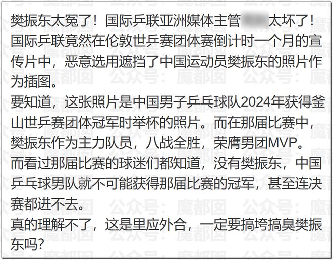 先把几个事情的后续说下,然后说标题上的事,可把我们气坏了!樊振东现在按照运动员的归属来说就是我们上海的运动员,我们作为上海的自媒体如果连自家的运动员都保护不了,如果连自家的运动员受到欺负都不出来说几句的话实在是愧对大家。