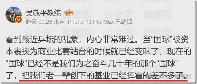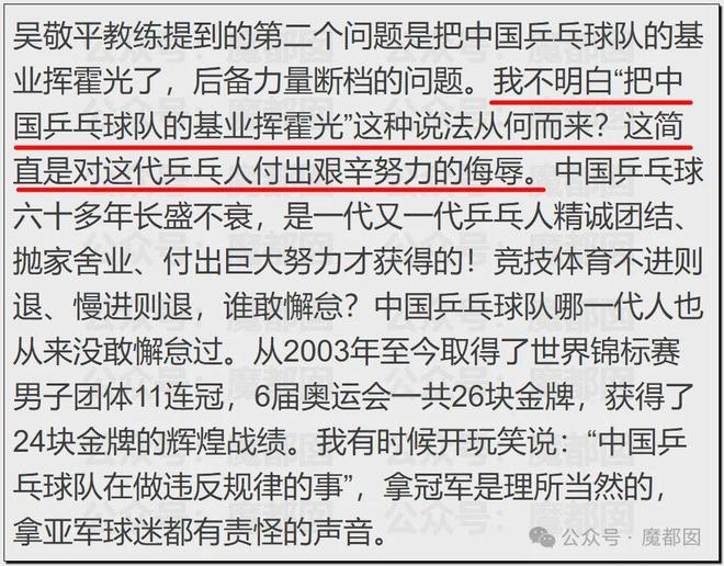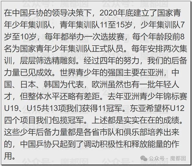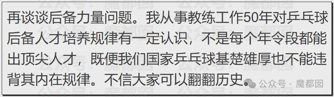 大家想象现在的男乒主力都是哪几位大概心里就有数了。这句话的分量重到什么地步?不能说全盘,几乎大部分否定了现在某些人。