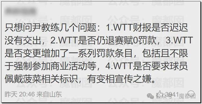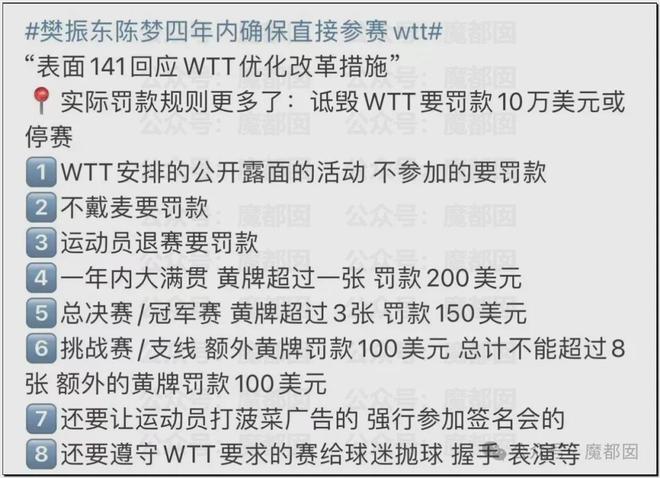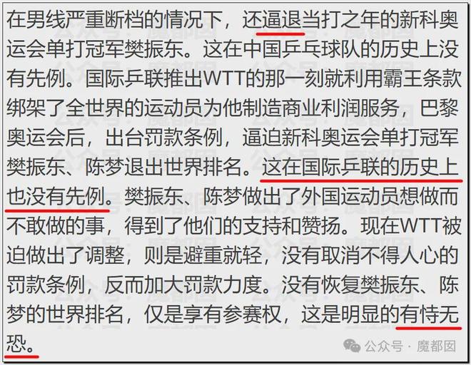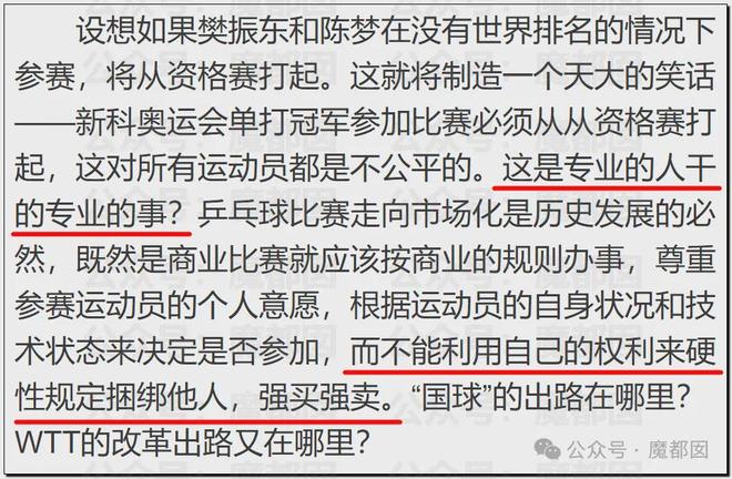 2、全力维护国际乒联。全力维护WTT,为WTT开脱,没有正面回答为何在规则下樊振东、陈梦这种选手都不给排名的问题。