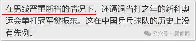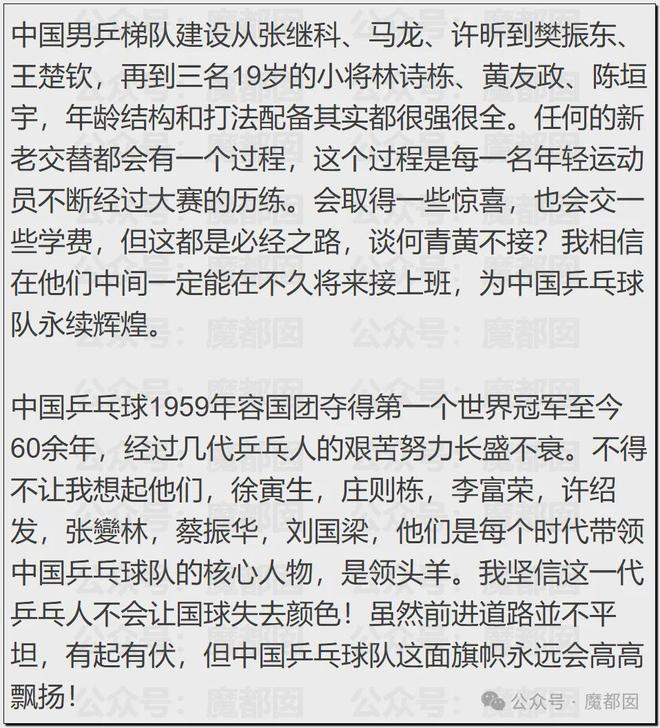 这句话写的非常重。“严重断档”,也就是说在他看来,现在的男乒几乎没什么能打的。
