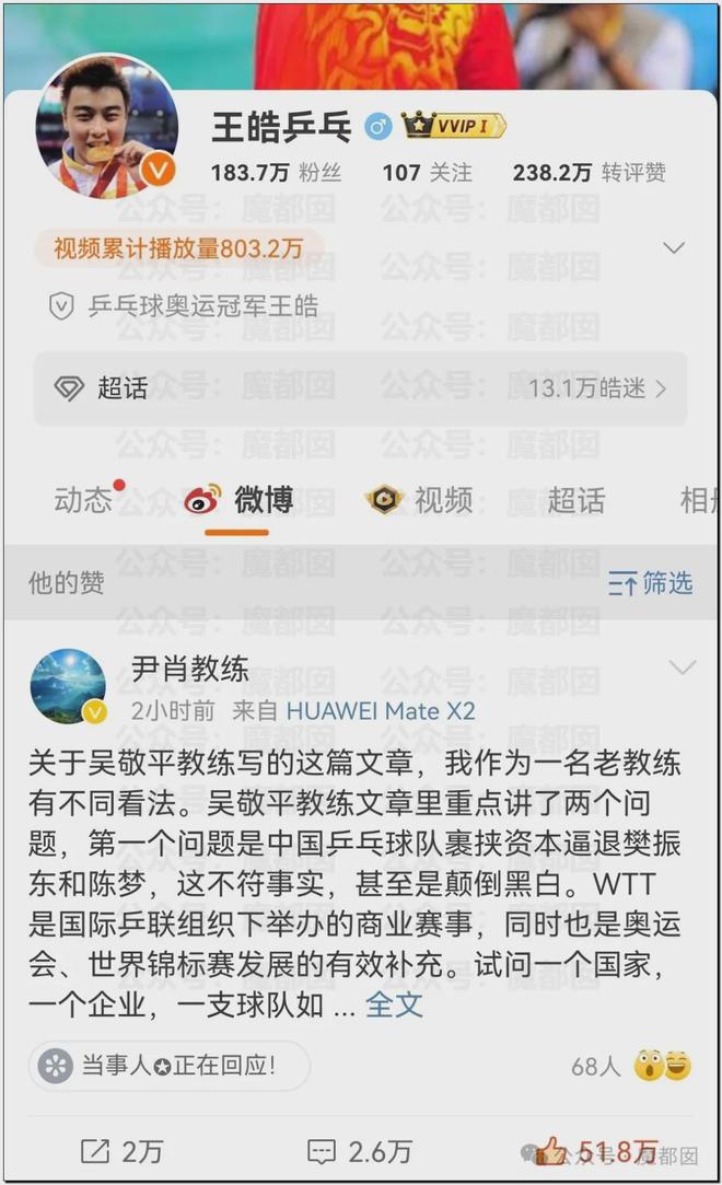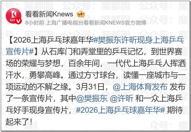 现在2026年,尹肖教练已经彻底弃博,也不知道当时如此熟练操作微博的到底是谁……而作为对比,上海体育今天也是发布了一个上海乒乓的百年回顾,其中樊振东的镜头非常非常多。