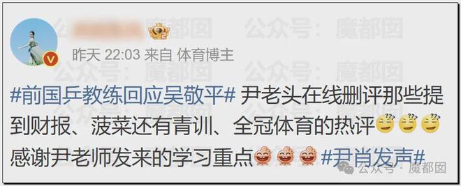 我们也很意外,第一次注册微博的尹教练把微博的删评也能很熟练的操作?网友们看到很多热评都没了: