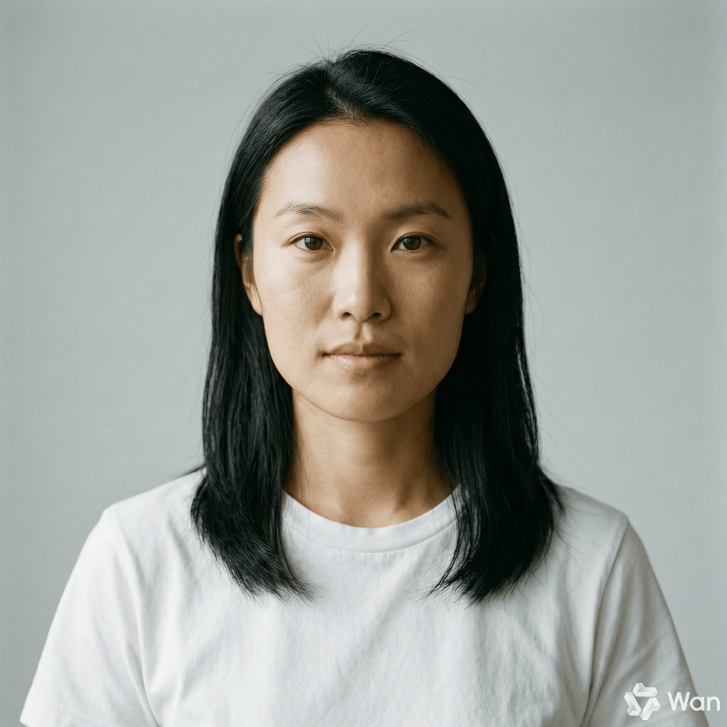 正面半身人像,一位25岁的东亚女性,【脸型的设定】,自然光线,眼神直视镜头,黑色直发披肩,穿白色圆领T恤,背景纯色浅灰,写实摄影风格,35mm镜头,浅景深。