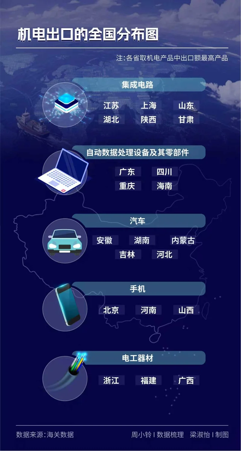南方周末记者梳理发现,广东、四川、重庆、海南出口金额最高的是自动数据处理设备及其零部件;江苏、上海、湖北、陕西出口最多的是集成电路;浙江、福建、广西是电工器材;安徽、湖南、内蒙古、吉林是汽车;北京、河南、山西则是手机。