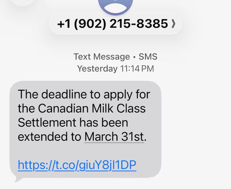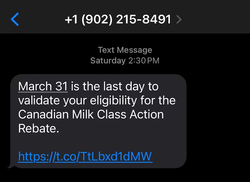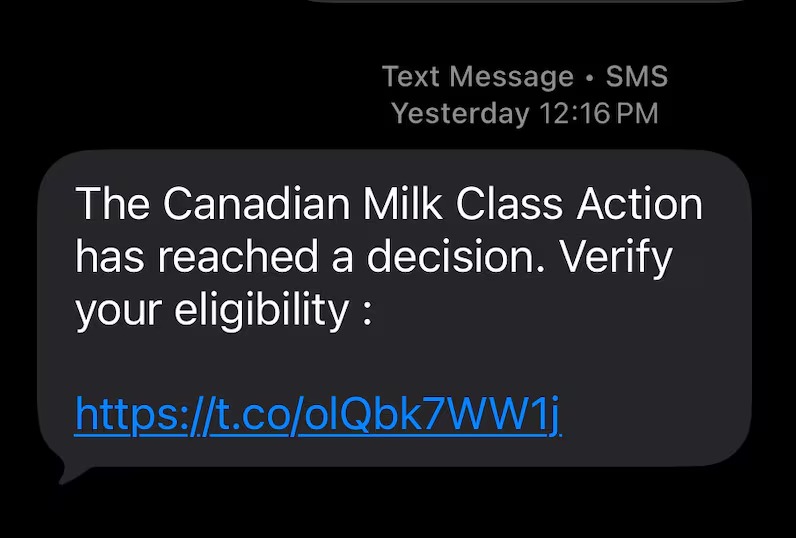 据CBC新闻报道,已有多名加拿大人收到类似诈骗短信。短信内容略有不同,但通常声称收件人符合“加拿大牛奶集体诉讼”赔偿资格,并附带链接,引导点击进入一个看似专业的网站。