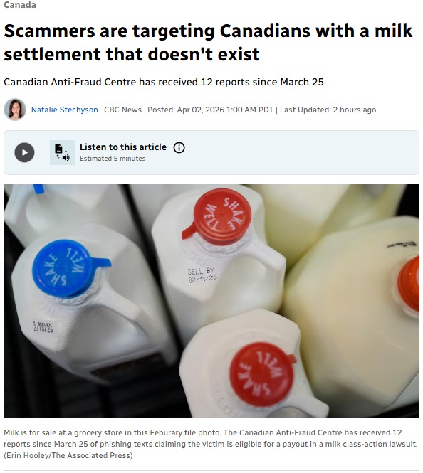 (加西网综合) 继“面包价格操纵赔偿”诈骗之后,加拿大近期再现新型钓鱼骗局——打着“牛奶集体诉讼赔偿”的幌子,诱骗民众提供个人及信用卡信息。