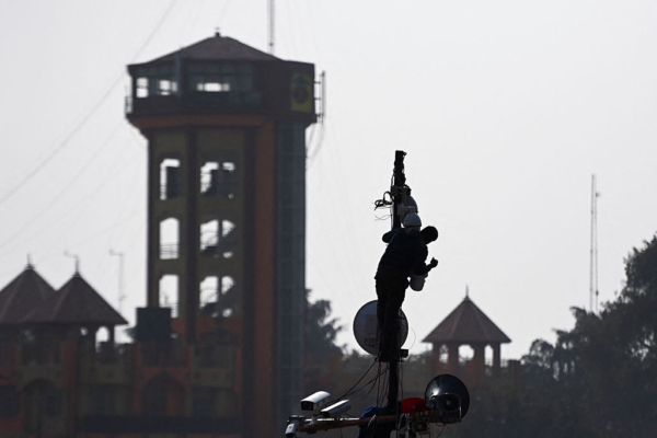 2021年1月13日,在印度哈里瓦,工人爬上路边的电线杆,检查摄像头。(Money Sharma/AFP via Getty Images)