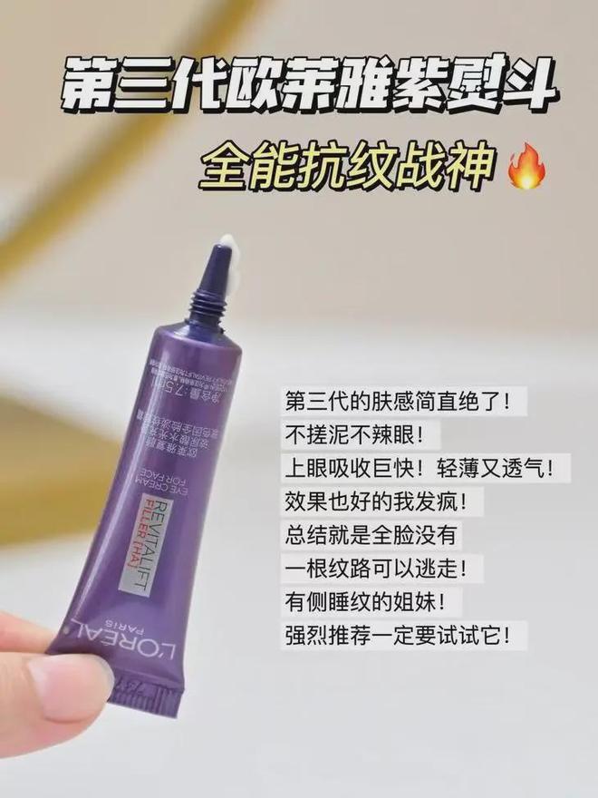 熬夜黨福星——歐萊雅紫熨斗眼霜,號稱眼紋小熨斗,壹支就能實現全臉淡紋、緊致抗皺。