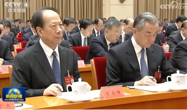 圖像來源,CCTV圖像加注文字,2025年12月10-11日的中共中央經濟工作會議央視畫面中,外長王毅(前排右)是排名第壹的政治局委員,馬興瑞沒有出現在畫面中。