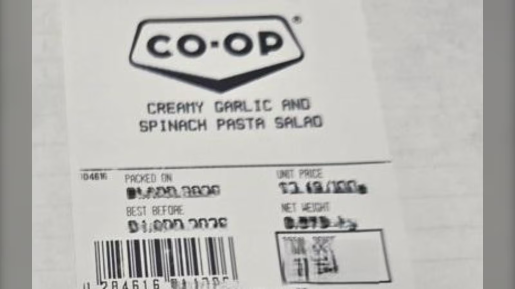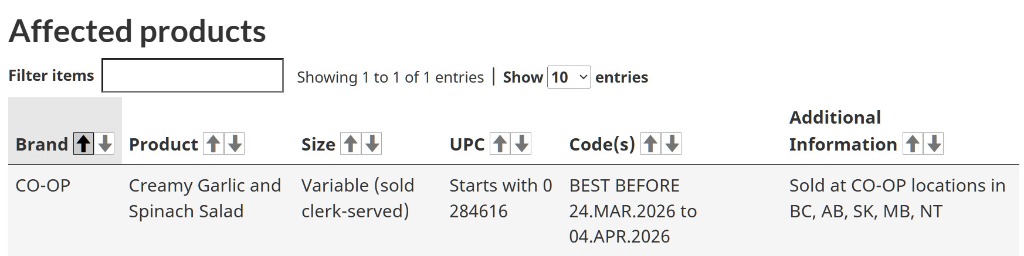 該機構表示,在艾伯塔省、BC省、曼尼托巴省、西北地區和薩斯喀徹溫省銷售的Co-Op品牌奶油蒜蓉菠菜沙拉(保質期在3月24日至4月4日之間),已被召回,不應食用。