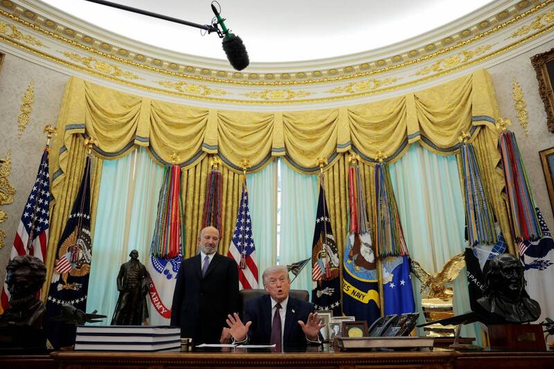 川普入主白宮之後,將前總統奧巴馬時期橢圓形辦公室使用的深紅色窗簾和地毯以金色的取代。(法新社資料照)