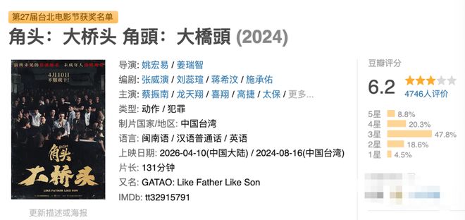 本周院線新片,大概只有壹部院線新片還能勉強關注下,那就是《角頭:大橋頭》,壹部來自台灣地區的黑幫片。