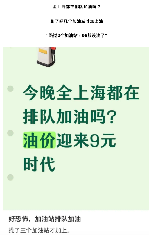 還有網友感歎,全上海都在排隊加油嗎?跑了好幾個加油站才加上油。“路過2個加油站,95都沒油了。”