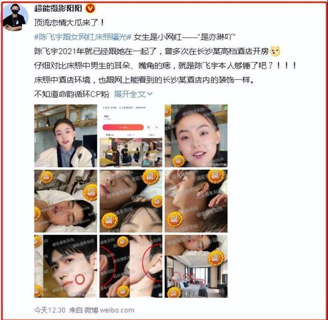 有網友曝光了陳飛宇和壹位女網紅的酒店私密照。照片裡的親密程度讓人沒法不多想。更勁爆的是,這位女方被扒出是陳飛宇的粉絲,而且疑似已婚,陳飛宇瞬間陷入“知叁當叁”的輿論漩渦。