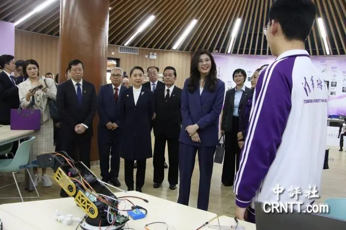 郑丽文在当天的参访中详细了解了AI技术融入各学科教学的实践成果,包括AI与体育融合的智能训练系统、师生共建的AI云校平台等核心项目。其间她也观摩了学生自制的各种科创作品,并同学生亲切互动。