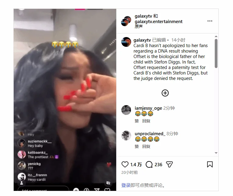 鑒定結果顯示,這個孩子確實是Offset的,並非她的現任男友SteflonDiggs。CardiB在直播中得知結果後情緒崩潰,當場痛哭。不少網友也對這壹突發情況表示意外,相關話題很快引發熱議。