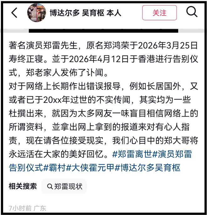 4月12日,郑雷的好友吴育枢发文透露了郑雷去世的消息。