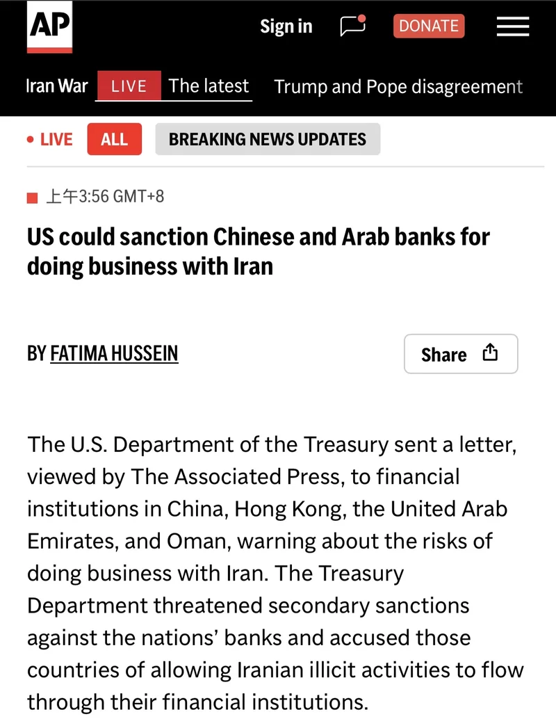 [香港] 美国或制裁与伊朗做生意的中国香港和阿拉伯银行