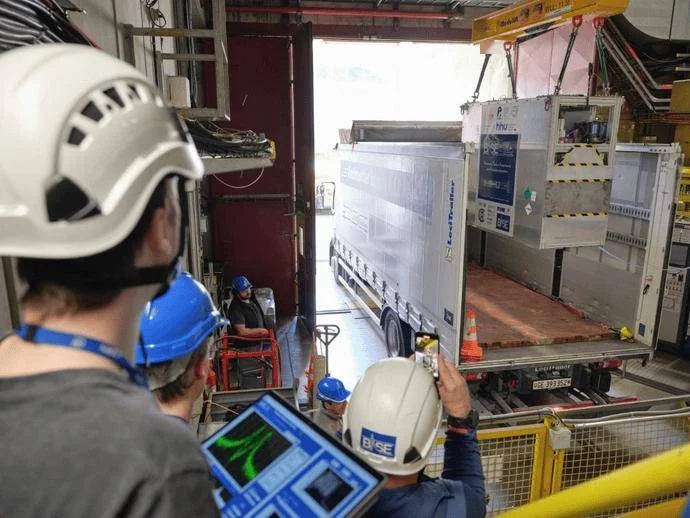 装有反物质的BASE-STEP正从起重机上吊起到运输卡车上;前景是海因里希·海涅大学的博士生 Marcel Leonhardt与BASE-STEP的移动控制终端。丨CERN
