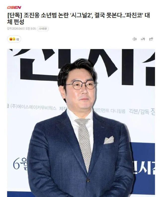 據韓國媒體報道,因少年犯犯罪記錄引發社會爭議的趙震雄主演的tvN 20周年期待作《信號2》最終被排除在6月及夏季的編排表之外。據悉,其空位將由Apple TV+系列劇《柏青哥》第壹季填補。