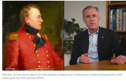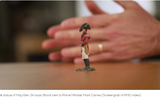 講話中,他還展示了壹尊艾薩克·布洛克少將(Maj.-Gen. Sir Isaac Brock)的小雕像。布洛克因在1812年戰爭期間抵御美軍入侵而被譽為“上加拿大英雄”。卡尼表示,這件由喜劇演員邁克·邁爾斯贈送的禮物提醒他,“當加拿大人團結壹致時,可以克服壹切困難”。