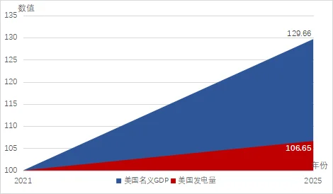 圖3 2021-2025年美國名義GDP和發電量的增長幅度(2021年數值=100)筆者自制