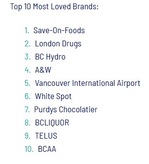 BC省最受喜爱的10大品牌如下: