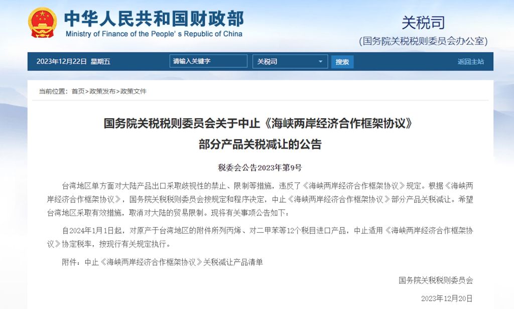 2023年12月,中國大陸以違反《海峽兩岸經濟合作框架協議》(ECFA)規定為由,對丙烯等12項台灣產品進口中止協定稅率。(財政部網站截圖)