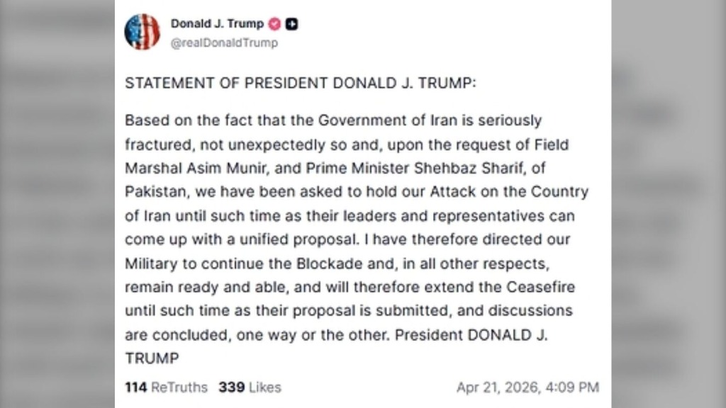 他在声明中称,已指示美军“继续封锁行动,并在其他方面保持准备状态”,并将停火延长至伊朗提出可行方案并完成相关谈判为止。
