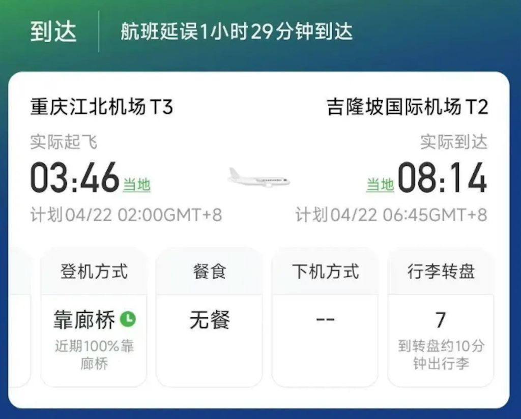 4月22日凌晨,壹架從重慶准備飛往馬來西亞吉隆坡的亞洲航空班機,機上壹名中國籍女子疑因不滿同伴未能登機,在機艙內大聲講電話,遭鄰座乘客制止後引發罵戰,隨後該女子更不滿空服員使用英文溝通,吐槽「國際航班,連中文都不會講」,最終導致航班延誤壹個多小時。