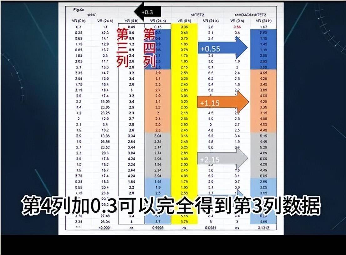 最為直觀的異常出現在Figure 4c中。該表格共有8列數據,其中第叁列與第肆列之間存在固定的數值關系,第肆列數據加上0.3,恰好等於第叁列。