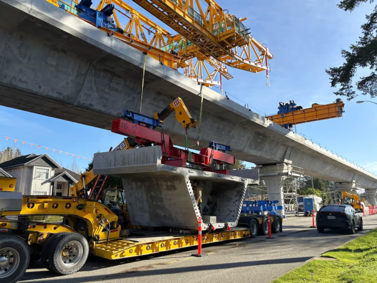 在坎贝尔高地占地 30 英亩的临时预制厂,所有 4400 个混凝土构件将于 2027 年夏季前生产完毕。然后,这些构件将分批运送到弗雷泽高速公路施工现场,在那里被送入机器进行加工。