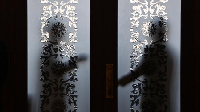 2024年3月6日,在北京全国人大期间,保安人员站在大会堂西藏厅外的玻璃门后。(GREG BAKER/AFP via Getty Images)