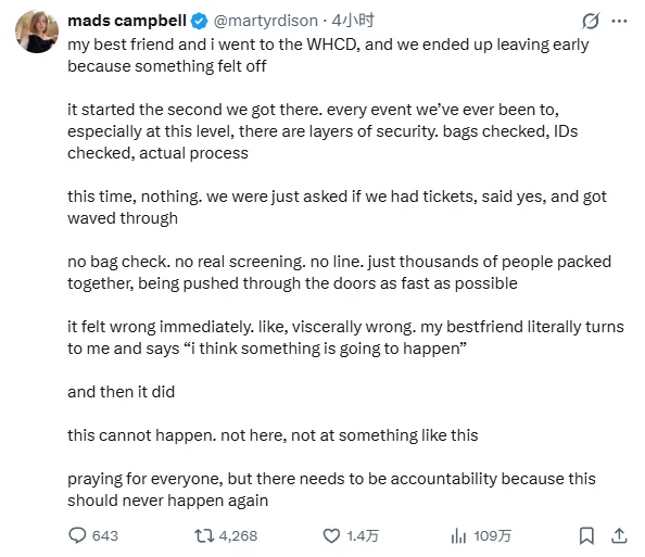 事發後,壹位名叫“馬茲·坎貝爾”(mads campbell)的網友發帖稱,她和朋友去了白宮記者晚宴,敢感覺到不對勁,提前離開了。