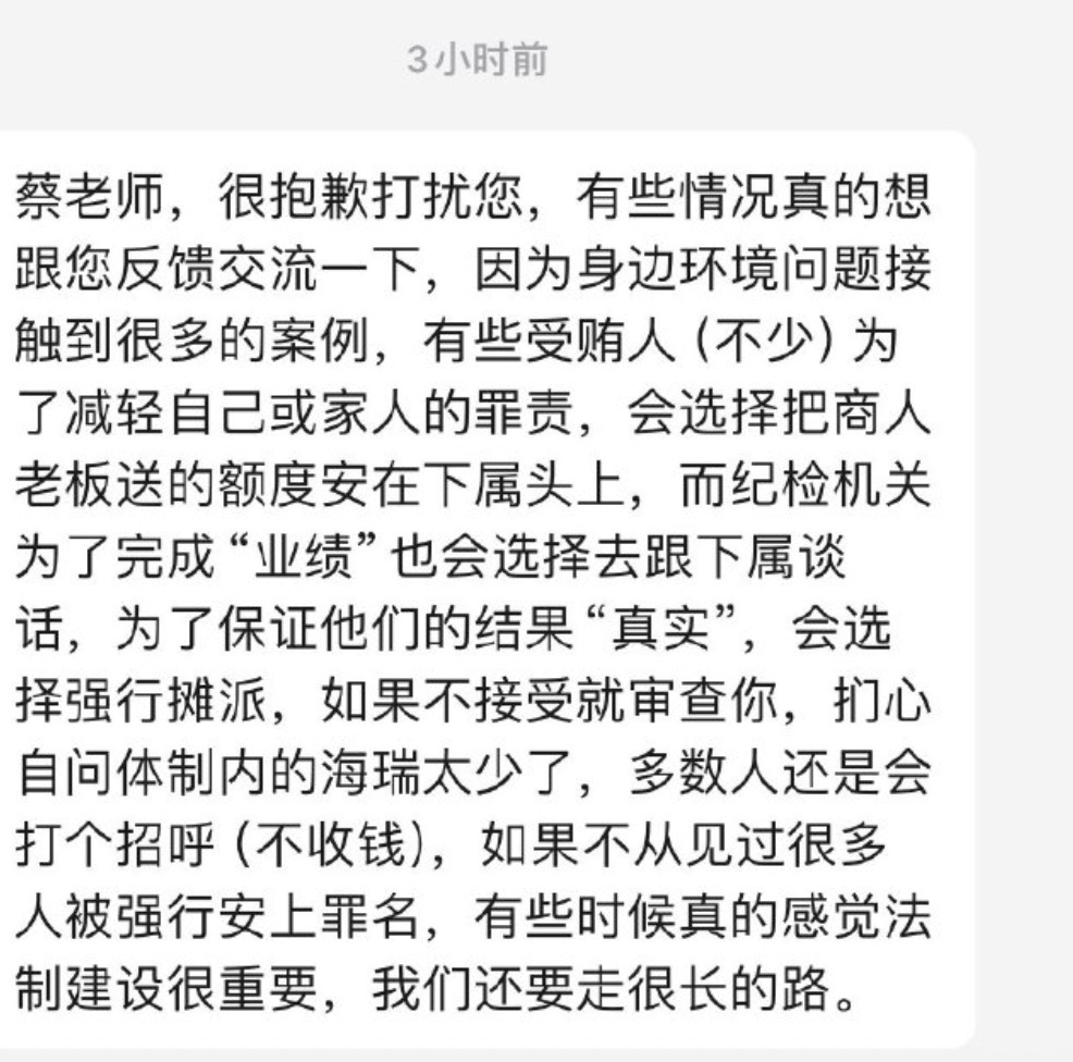 微博知名法律博主近日发帖爆料一网友发来的私信,称中共纪委为了完成“业绩”给官员按罪名。