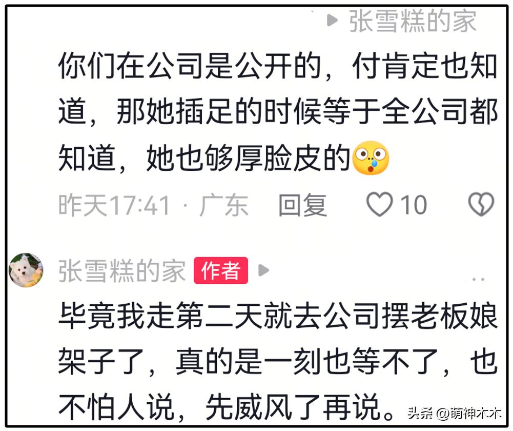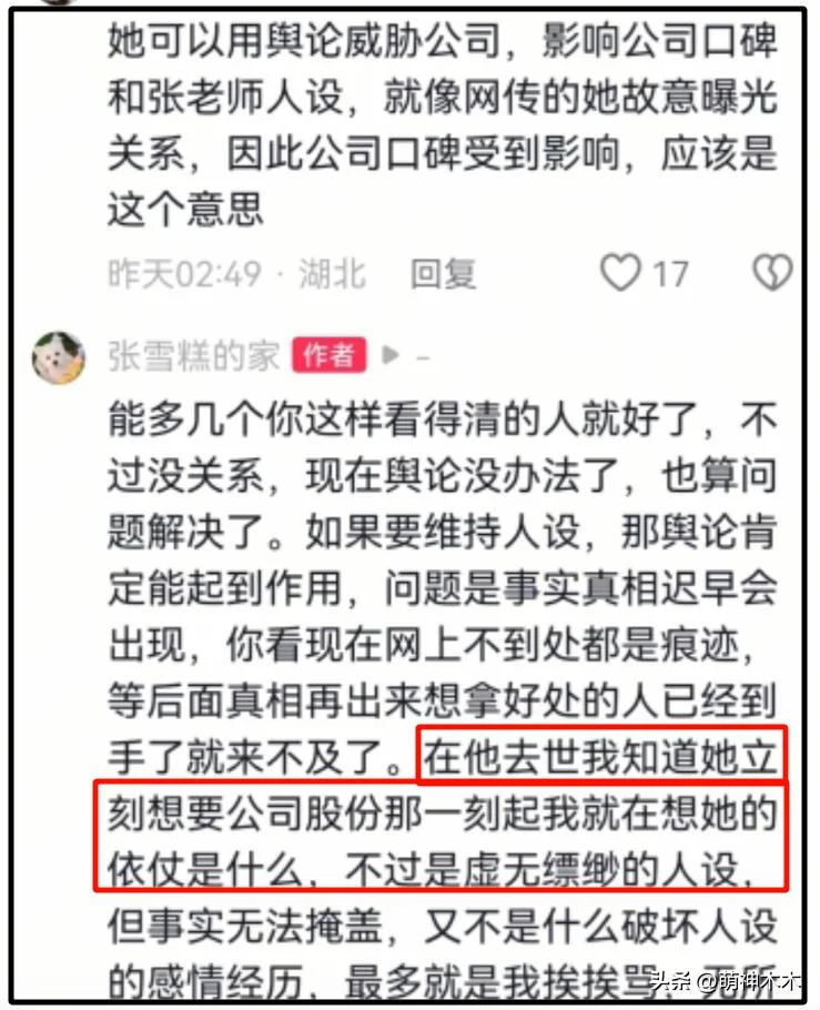 還透露從張老師去世那壹刻起,付某就想要公司股份,還試圖利用輿論立人設,但似乎沒有成功。張某某透露她和張老師分手離開公司後的第贰天,付某就去公司耍威風,擺老板娘架子了。