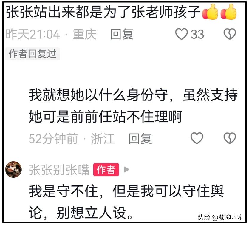 有網友說張某某現在出來也站不住理,畢竟她只是前任,沒法幫孩子守住利益。張某某直接喊話,“我是守不住,但是我可以守住輿論,別想立人設”。