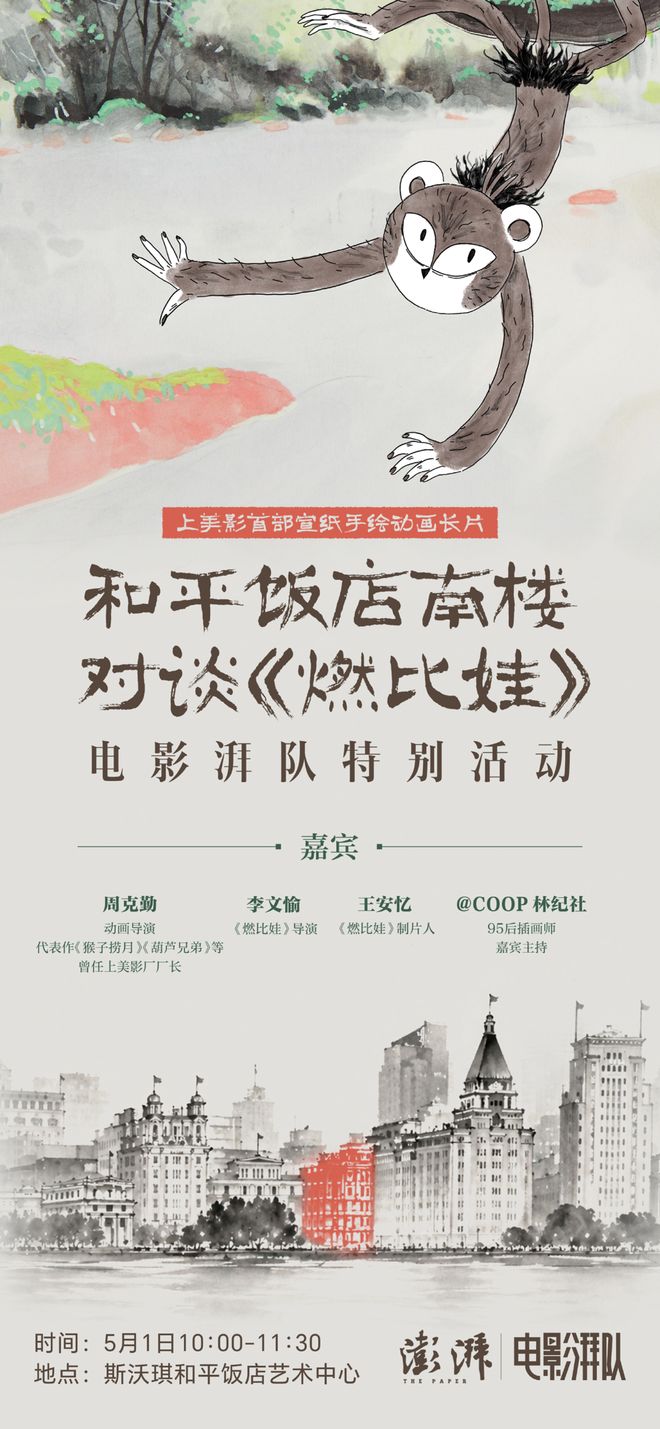 值得壹提的是,5月1日上午 10:00-11:30,澎湃新聞「電影湃隊」特別活動將邀請《燃比娃》主創團隊,在百年外灘的老建築中,舉辦壹場對談沙龍。屆時,在斯沃琪和平飯店藝術中心,上美影老廠長、《葫蘆兄弟》《猴子撈月》導演周克勤,《燃比娃》導演李文愉、制片人王安憶,將與 95 後插畫師 @COOP 林紀社壹同圍坐,從老壹代動畫人的匠心堅守,聊到青年創作者的探索突圍,拆解《燃比娃》的宣紙手繪密碼,也聊聊中國動畫跨越半個世紀的傳承與新生。澎湃新聞屆時將以直播形式呈現這場跨越代際的對話,線下觀眾招募已在澎湃有戲公眾號同步開啟,敬請關注。